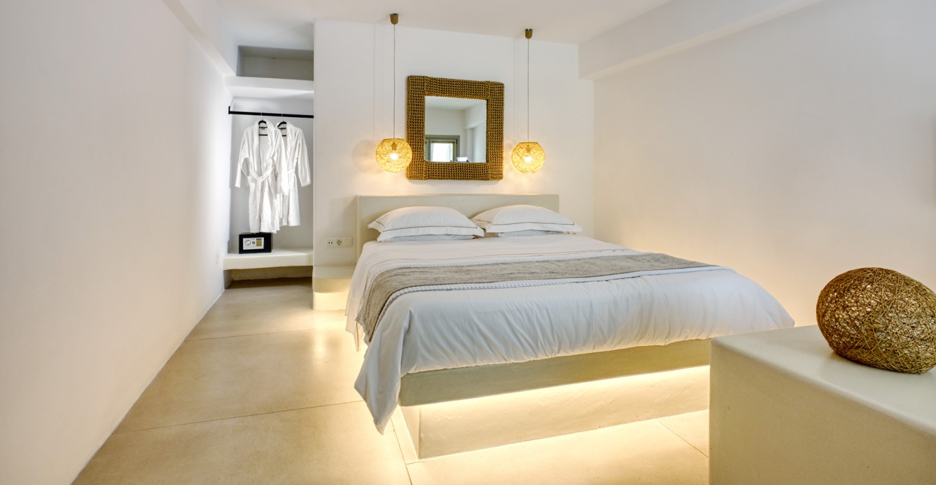 Where Cycladic serenity meets refined simplicity, the Deluxe Pool View Rooms at Nodo Boutique Hotel offer a calming oasis just steps from the water’s edge. These rooms are thoughtfully crafted in the hotel’s signature design language: sculpted cement surfaces, soft-edged architecture, built-in beds, and an organic palette of whites, greys and earthy tones that echo the soul of Mykonos.