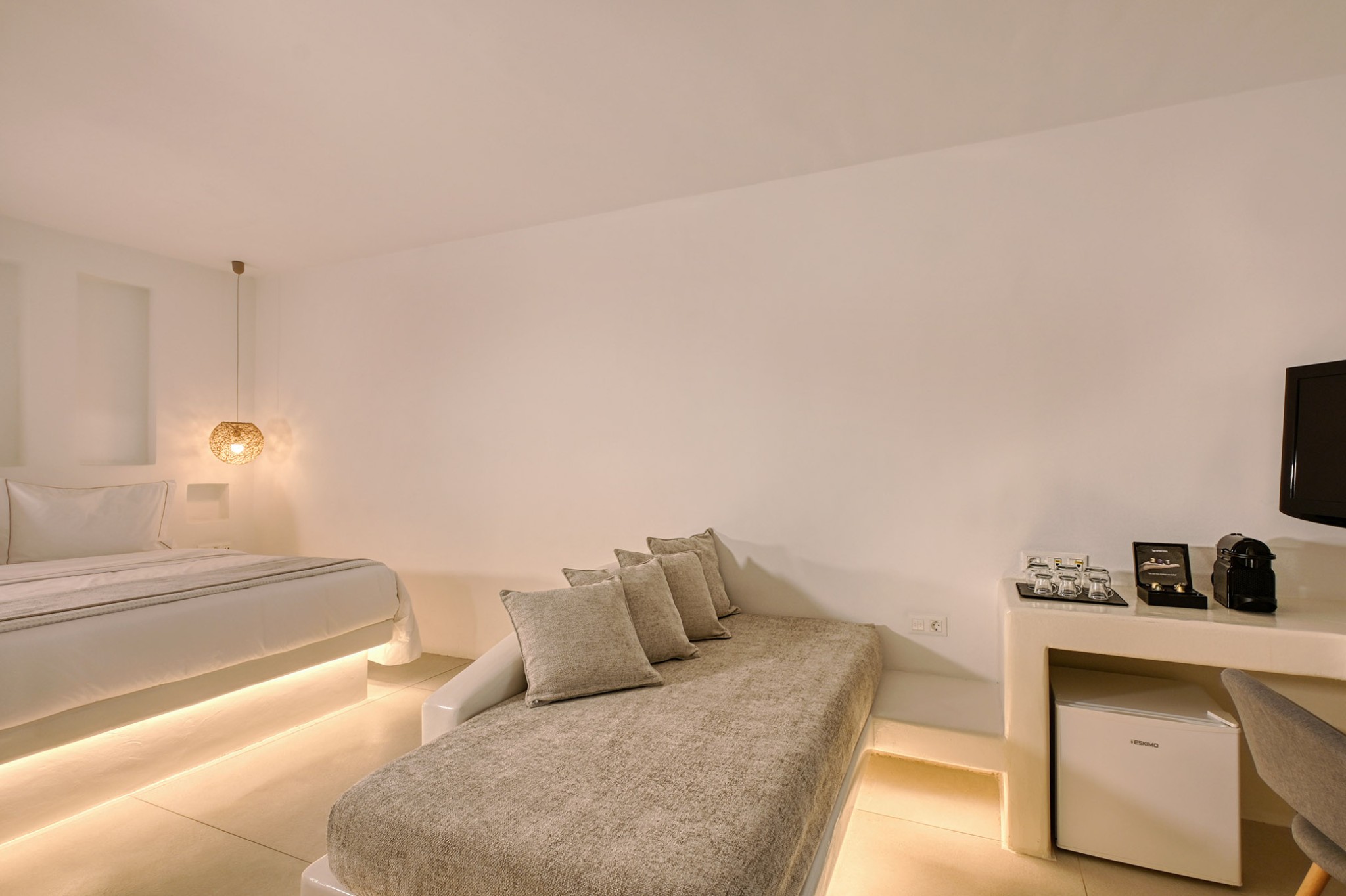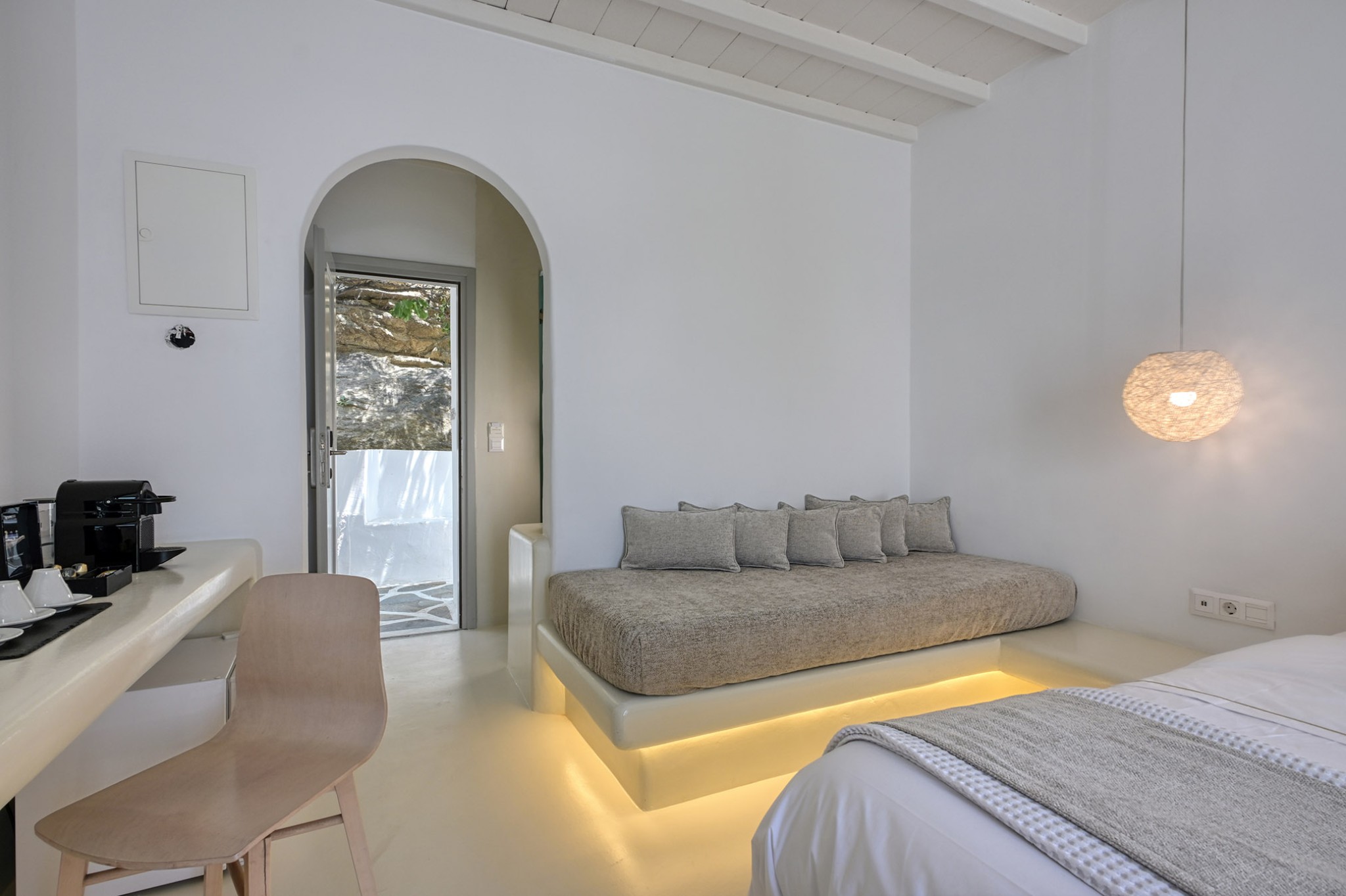 The custom-built cement plaster furniture creates a seamless flow, merging function with bold design. Sink into the plush king-size bed, while a hidden sofa bed extends your space for an additional guest — perfect for a small group or family.